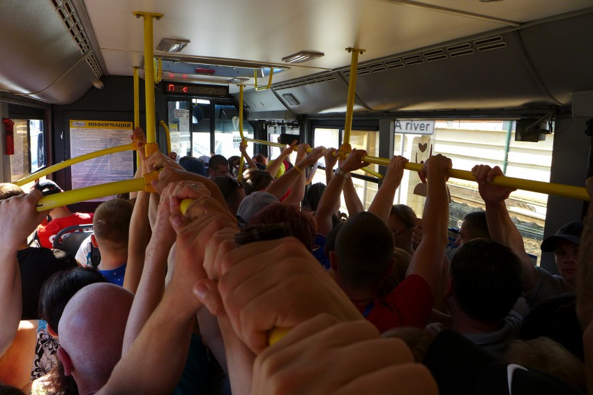 И, если в дни матчей, всё достаточно хорошо организовано в плане автобусов, то в другие дни всё весьма печально, 125с явно не хватает, очень много людей, водители вынуждены отказывать людям, приходится пропускать по 2 автобуса, чтобы хоть как-то втиснуться.