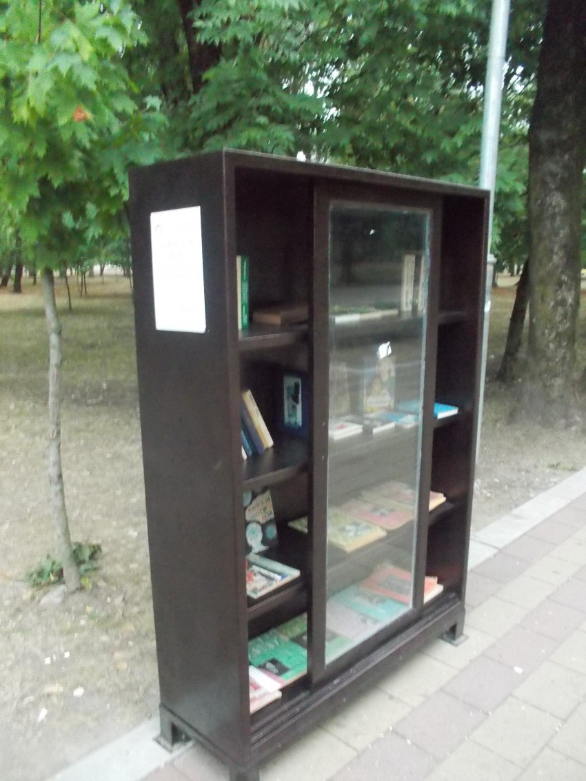 Были в центральном парке Нальчика. Вот что понравилось. Стоит посреди парка на главной аллее вот такой книжный шкафчик — обычный такой шкафчик — с полочками и стеклом.