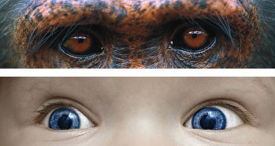 Среди всех приматов человек единственный, кто имеет хорошо видимые белые склеры и цветные радужки глаз. У остальных приматов склеры темные, хотя временами случаются исключения // Cyril Ruoso/JH Editorial; Gorilla Photo Agency/Alamy