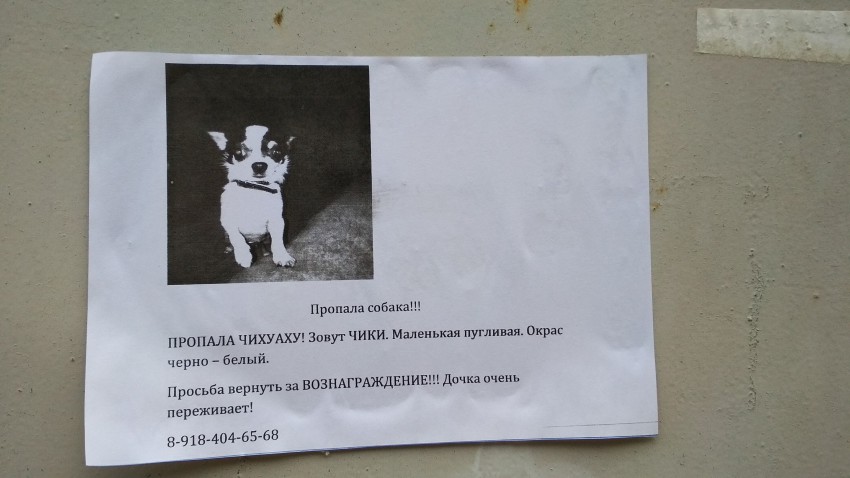 22 сентября днём в микрорайоне Бытха на улице Ясногорская была найдена маленькая собачка породы Чихуахуа (девочка) бело-чёрного окраса. Видно, что собака домашняя, чистая и ухоженная.