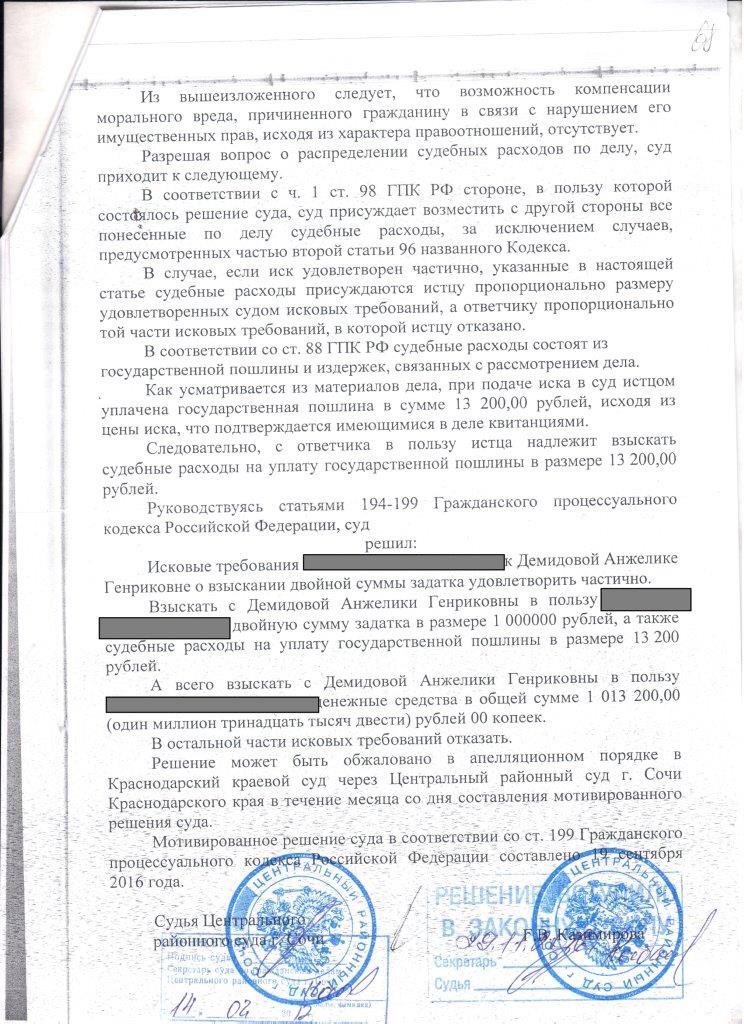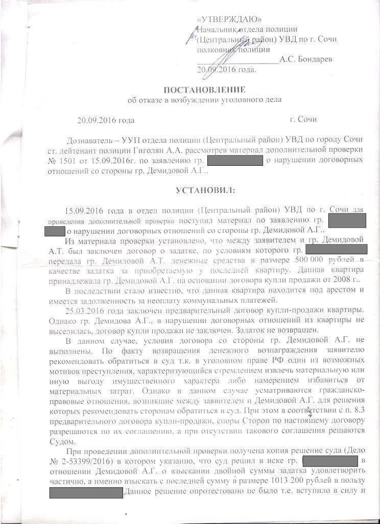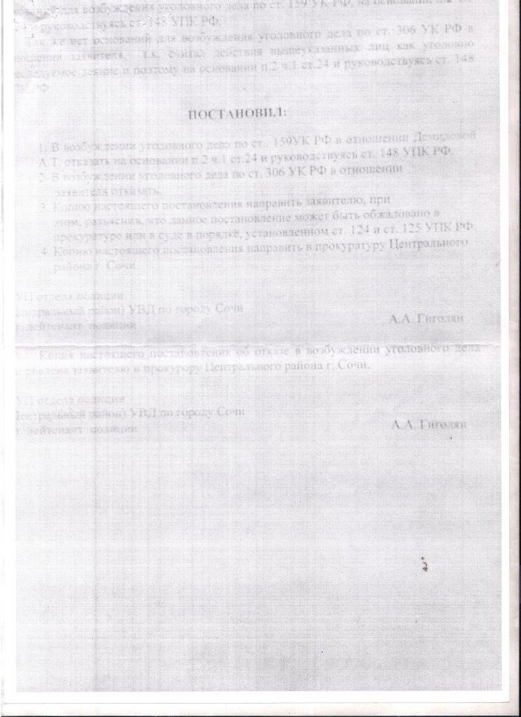 Отдавать денежные средства она отказалась, объясняя это тем, что продавать она квартиру не отказывается и что можно купить ее по договору цессии переуступки права. Прошло пару месяцев но ничего не происходило, подруга обратилась в полицию, но возбуждать уголовное дело отказались так как нет состава преступления, хотя он на лицо, подруга обращалась в прокуратуру Сочи, в прокуратуру края, в генеральную прокуратуру, в аппарат президента, это действий никаких не возымело, получить обратно свои деньги подруга не может.Прошло уже 2 года и ничего не меняется мы очень хотим чтоб все в городе узнали какая на самом деле это семья, что они живут за счет мошенничества обманывая людей, мы хотим чтоб вы помогли подруге забрать свои деньги и восстановить справедливость.