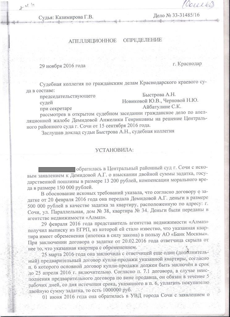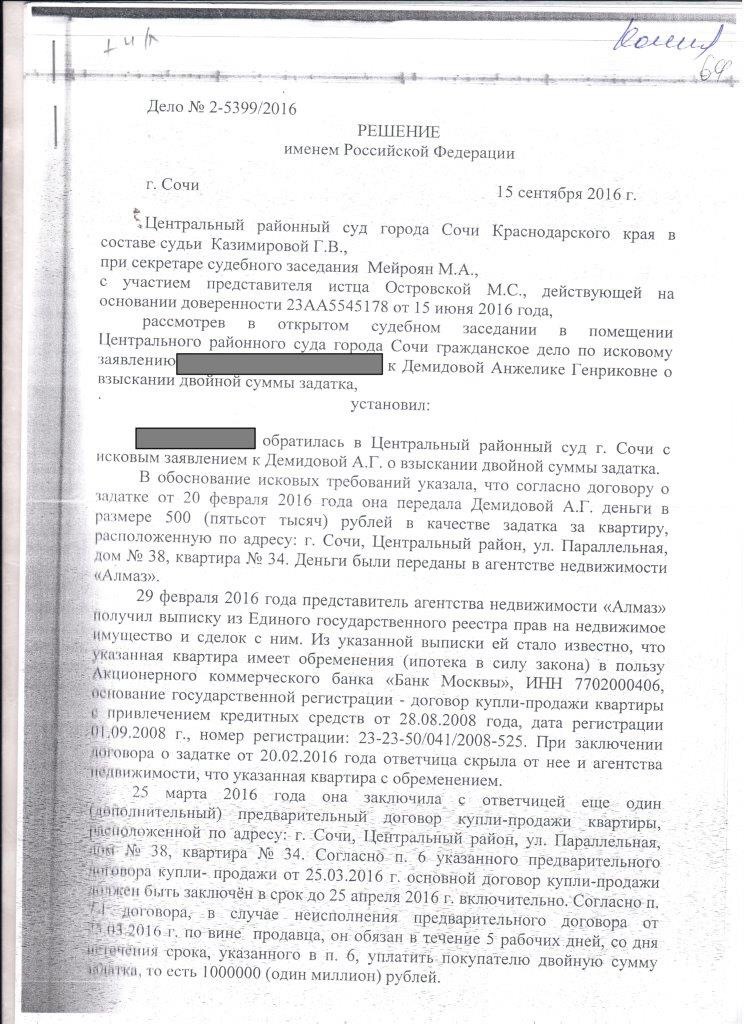 Здравствуйте. С моей подругой произошла вопиющая история, которой я хочу с вами поделиться. В феврале 2016 года она обратилась в риэлторское агентство «Алмаз» с целью покупки квартиры. Одна из квартир ей понравилась. Работники агенства заверили ее что с документами на данную квартиру все в полном порядке что она проверена, так же собственница квартиры показала копии свидетельства регистрации. Собственница очень сильно просила внести залог за квартиру в размере 500000 тысяч рублей(пятьсот тысяч рублей), так как ей чтоб съехать необходимо было срочно доделать ремонт в другой квартире, на ее условия о большом залоге подруга согласились и взяла в банке кредит в размере 500000 рублей. После этого был подписан договор, в котором было указано что собственник подтверждает что обременений на квартиру нет.