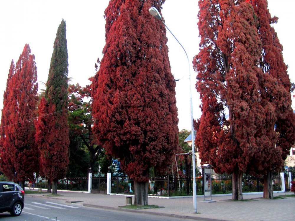 В районе Свято-Троицкого храма и офиса МТС, в Адлере, произошла массовая гибель кипарисов. Платаны почти полностью сбросили листву. Засохли кустарники. Кто может объяснить причину произошедшего?