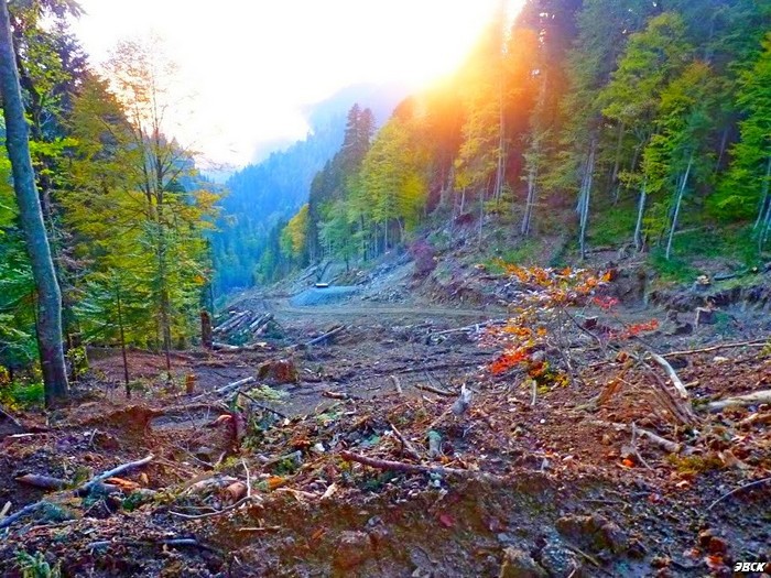 Спустившись в зону леса, активисты увидели апокалиптические картины массового уничтожения заповедного леса и разрушения горных ландшафтов под строительство технологических дорог, будущих «канаток» и горнолыжных трасс. Девственный высокогорный лес, являющийся ценностью мирового масштаба, подвергнут безжалостной вырубке. Трупы тысяч вековых деревьев лежат вдоль километровых прорубленных просек, ширина которых достигает 50 и более метров. Во время инспекции строительные работы шли полным ходом. В районе впадения в реку Миндолихи ее левого притока, где сходятся две главные дороги, вдоль которых осуществляется «освоение новых территорий», организован лагерь строителей. Рядом с ним строится нижняя станция канатной дороги.