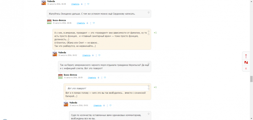 На американском сайте в адрес главного санитарного врача России Онищенко, который год уже как и не главный вовсе, но это не важно, выдавливают из себя крокодильи слезы, как их тут на курорте не дооблизывали и не уберегли от пищевого отравления. Купаюсь все лето и че-то никакая кишечная палочка ко мне не липнет. Более того, за всю жизнь никогда не было, уж тем более от купания в море!!! Мало того что они все приехали без какой-либо культуры поведения вообще, так ещё и наглости хватает обсерать (вот во всех смыслах) наш родной город!