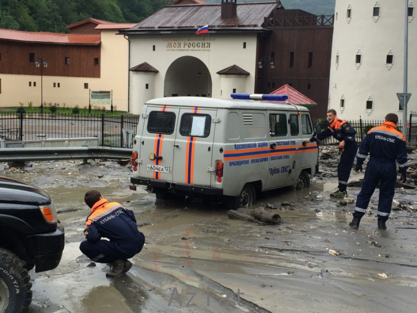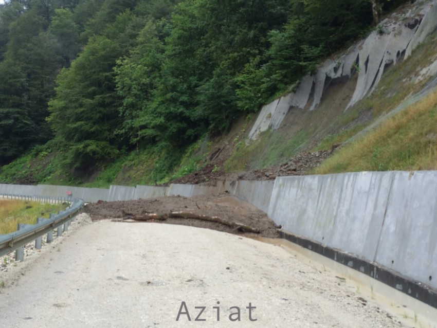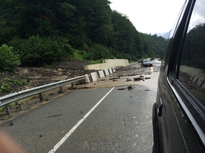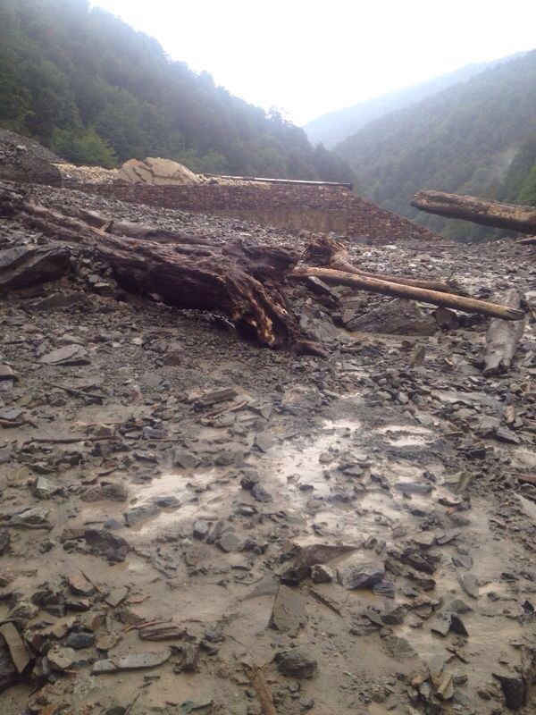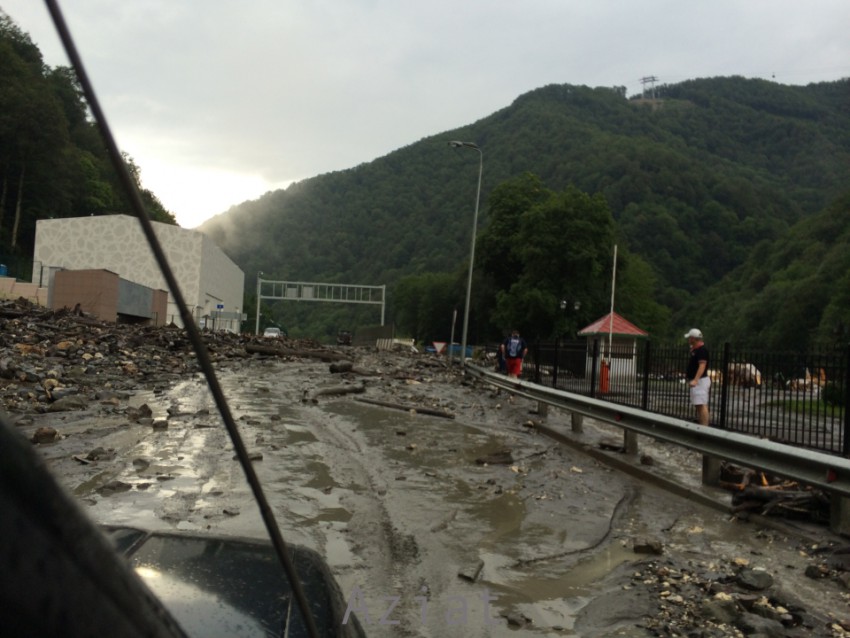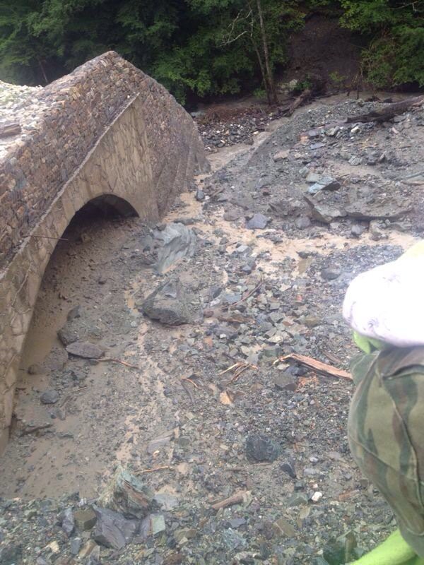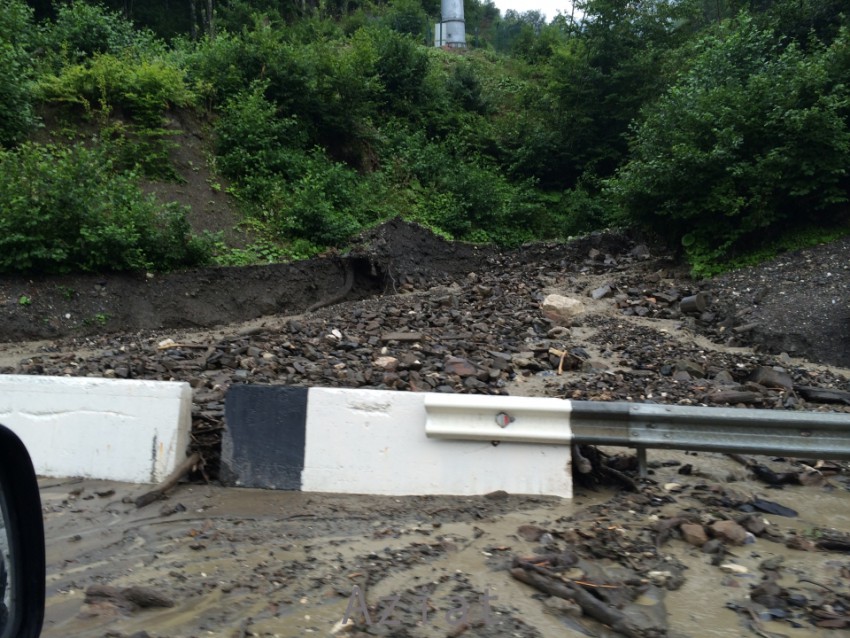 Сошло несколько селевых потоков. Один прямо в районе Роза Хутор, вода подтопила стоянку, где автобусы останавливаются. Второй, побольше на Салимовском ручье, там мы Уазик МЧСный вытаскивали. Дальше по дороге обвал небольшой за который уже проехать не получалось. Ну самый сильный сель засыпал тоннель дальше на дороге по самый верх( мне фото показывали, а сами мы туда не ходили ). Люди по верху его переходили, бросив машины на той стороне.