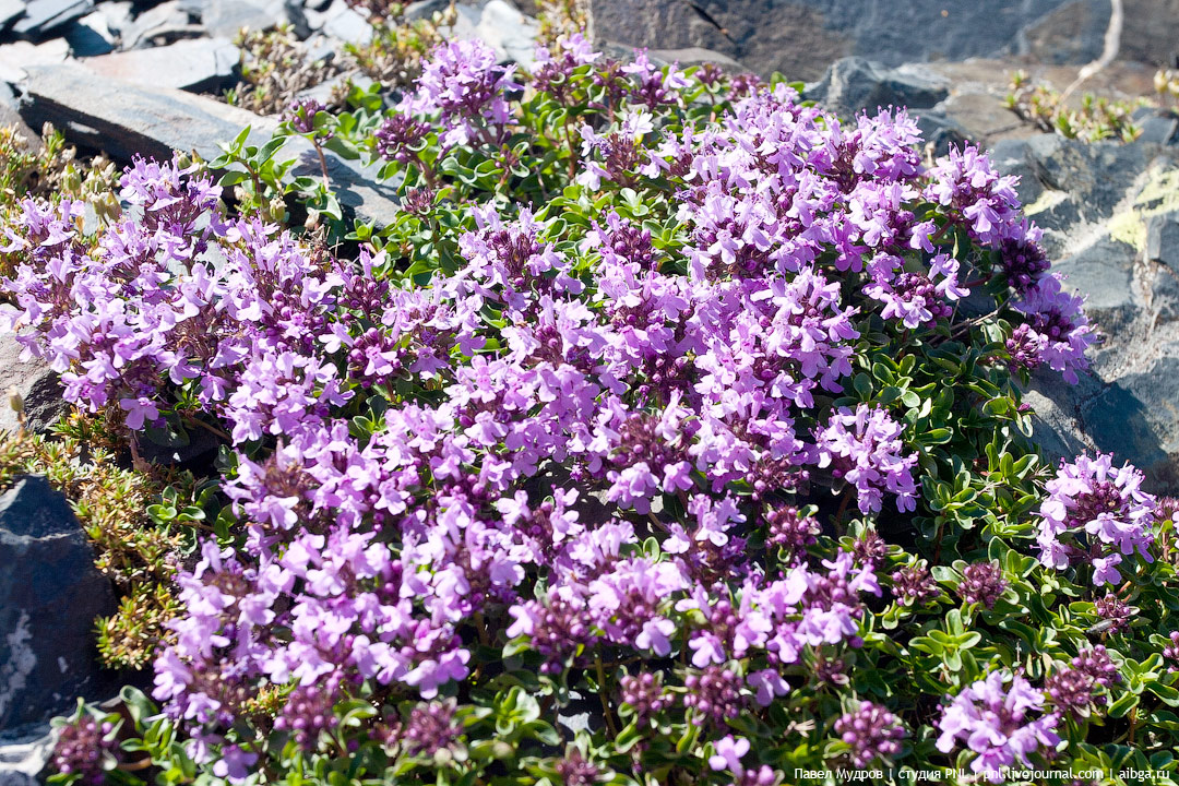 3. Кустики пахучего чабреца встречаются на скалах в хребтовой части высокогорий Кавказского заповедника. Июнь.