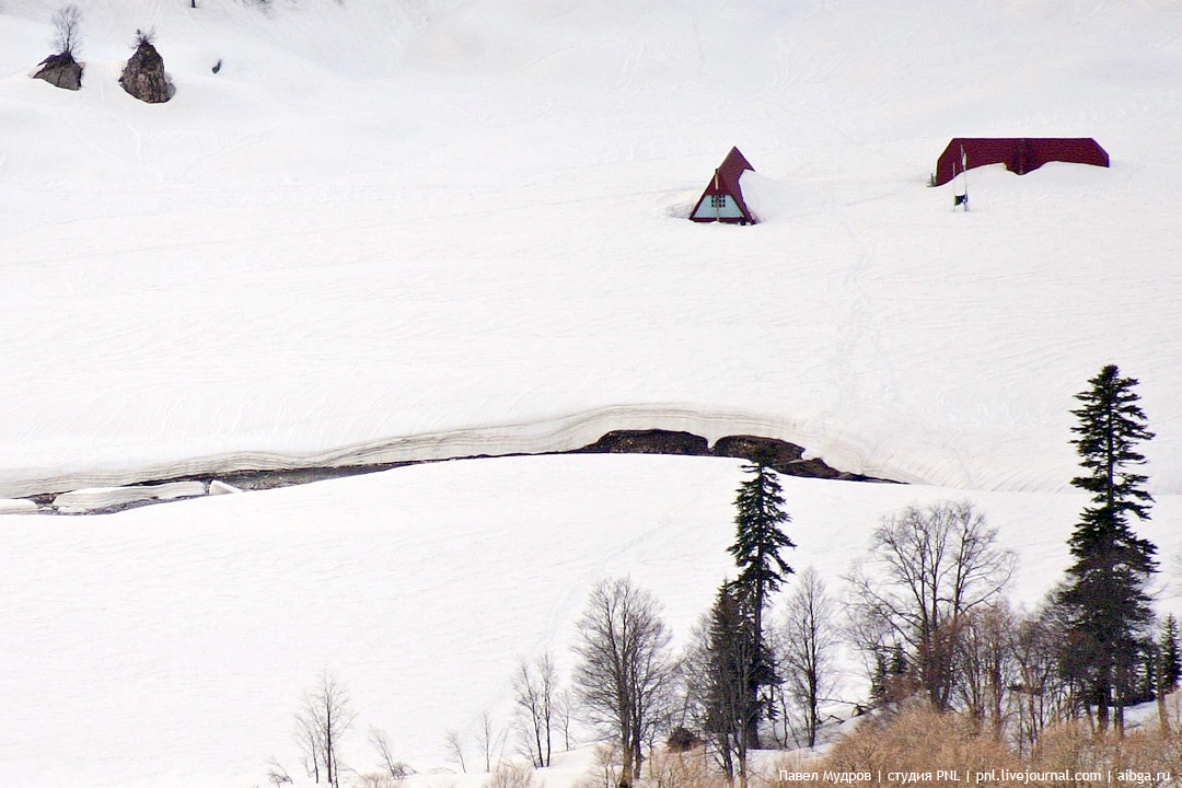 4. Приют Фишт «зимой». На самом деле это май и зимний снег еще не успел растаять. Первый этаж домиков приюта еще полностью под снегом, доступны только чердаки. На переднем плане течет река Белая.