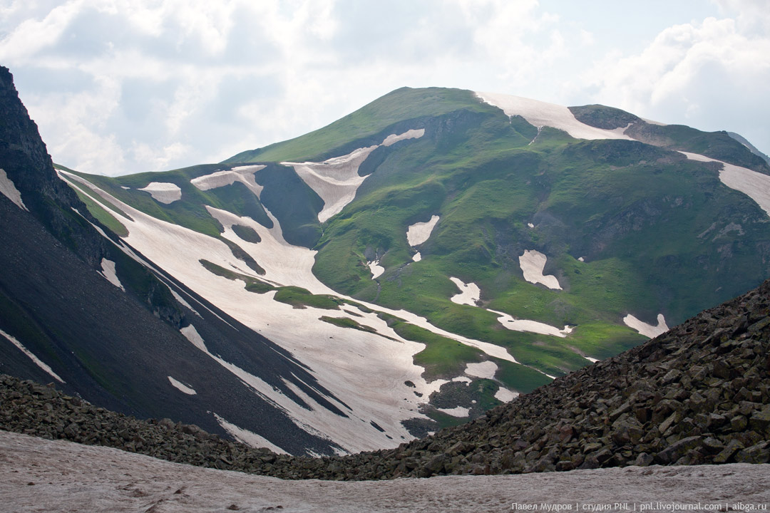 7. Перевал Пятерых в хребте Аишха, вид с востока. Июнь.