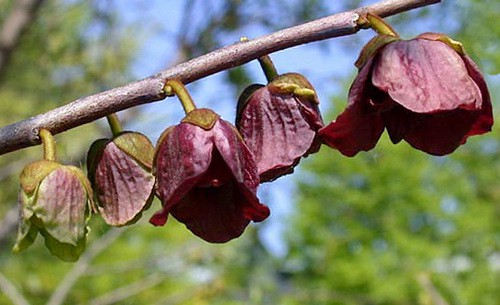 На ветках на коротких толстых черешках располагаются светло-зеленые продолговато-яйцевидные, заостренные на вершине и суживающиеся к черешку кожистые листья. Они очень крупные, в длину достигают 22— 35 см, в ширину — 7 —12 см. Нижняя и верхняя стороны молодых листьев сильно разнятся: снизу они опушены, а сверху глянцеватые, блестящие. На прошлогодних побегах одновременно с листьями в пазухах их в апреле — мае (в зависимости от погоды) распускаются коричнево-пурпуровые колокольчатые цветки. Они делают растения декоративными.