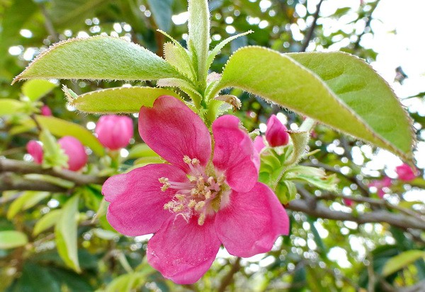 Айва спешит показать свои цветы.