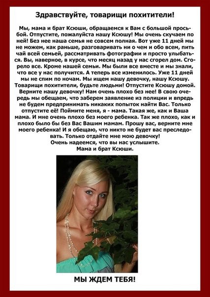 — почему полиция не разместила у себя на сайте ни одной новости о поиске Ксении, нет объявления в разделе о без вести пропавших, на стендах УВД о розыске людей — НИГДЕ!