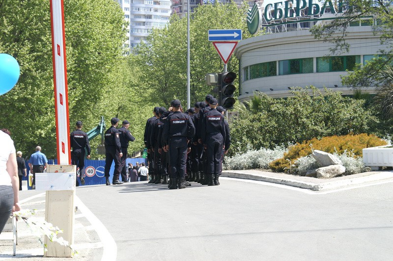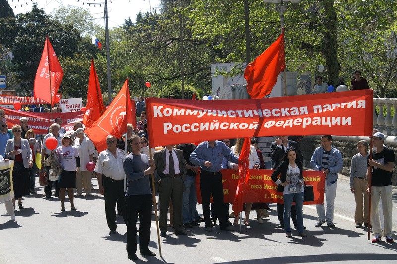 Дело в том, что одновременно с митингом и концертом, организованными компартий, своё шествие по тому же маршруту проводила администрация города. И, как всегда, административный ресурс был осенён флагами Единой России. Но была и одна новинка, объяснившая причину задержки полицией движения колонны под знамёнами КПРФ. Дело в том, что в построенной на пути следования демонстрантов трибуне-помосте восседал сам градоначальник, он же главный сочинский единоросс А. Пахомов. Его нежный, исходящий безупречной честностью и добротой взор, направленный к «правильным» демонстрантам, никак нельзя было омрачать видом «неправильной» колонны, шедшей под знамёнами, транспарантами и лозунгами КПРФ, а также с лозунгом против строительства Кудепстинской ТЭС. Так что за те 5-7 минут, пока полиция и сотрудник администрации искусственно удерживали движение колонны КПРФ, наш досточтимый мэр, как говорится, «успел вовремя смыться», распустив заодно и находящихся там же операторов электронных СМИ. Тем самым, поставлен первый предолимпийский рекорд на пути к проведению ЗОИ-2014. То ли ещё будет!