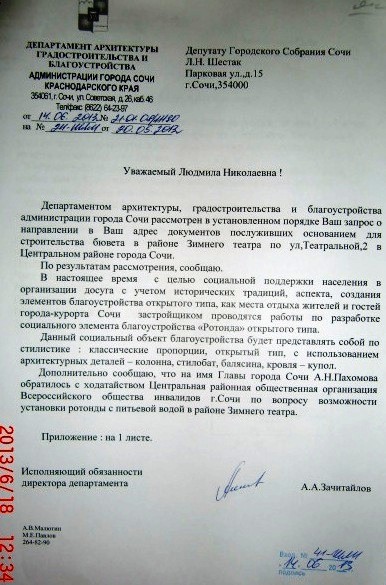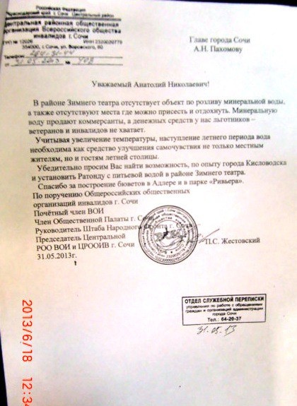 — Я представитель общества инвалидов и мы хотим бювет питьевой воды около зимнего театра, так как в этом месте обычно скапливается очень много, страдающих от жажды, инвалидов. Были случаи когда они обезвоженные не могли самостоятельно добраться до дома.