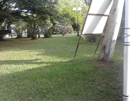 Стендик с информацией по бювету-ротонде притулили к стволу эвкалипта. Строительства дерево не переживет: