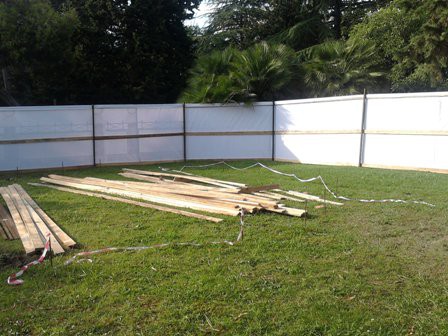 Позавчера были просто палки, вчера появился нежный и крайне интеллигентный забор — палки, железки + баннер, на котором опять-таки изображен заборчик.