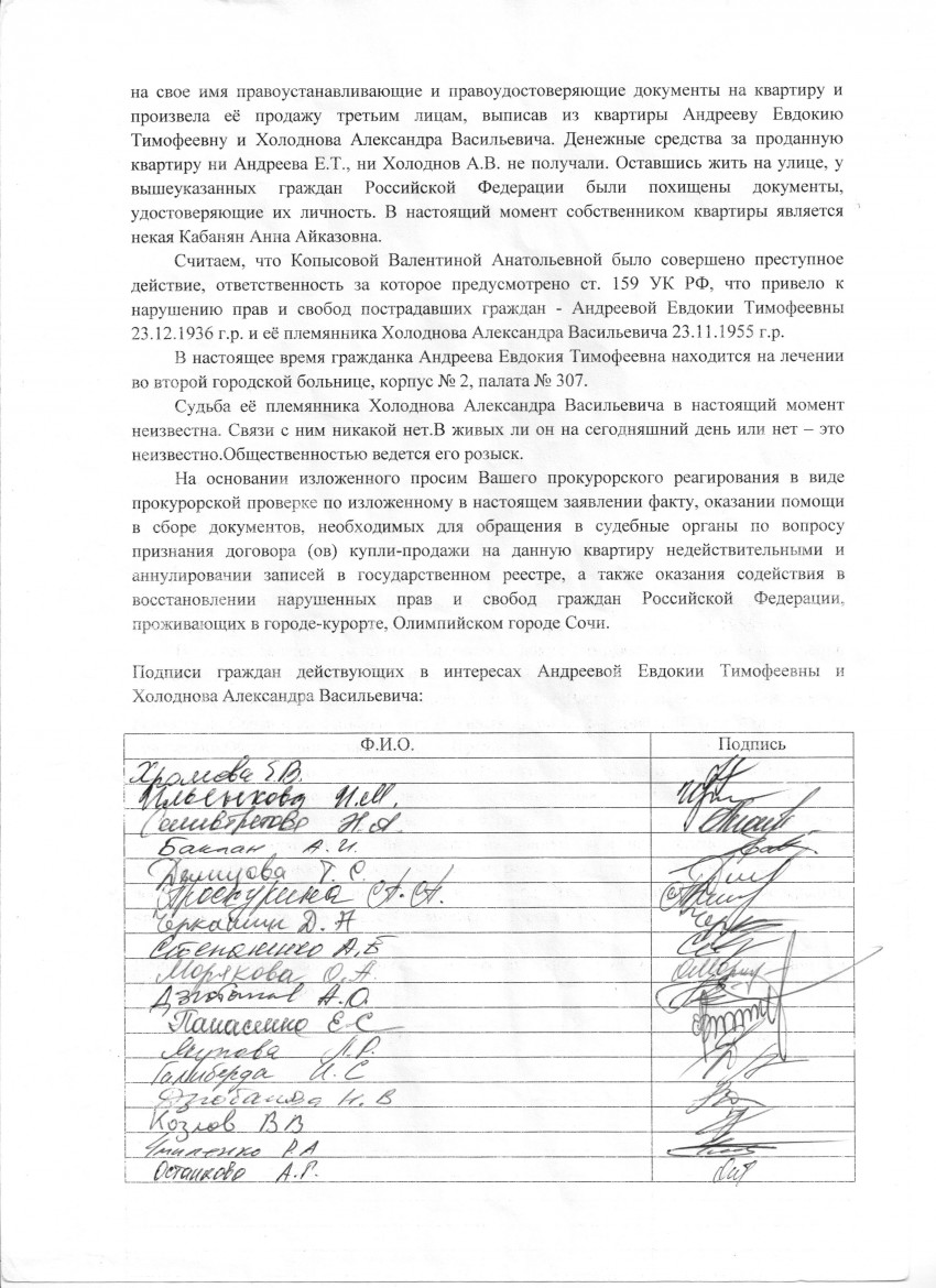 Её племянник 1955 года рождения Холоднов А.В. — слава богу нашёлся, выглядит на 70 лет, так же инвалид 2 группы, с трудом понимает что произошло и как исправить ситуацию. Органы УВД осведомлены об этой ситуации с мая месяца 2013 года.Так сказать с праздников дорогие товарищи. Преступники — спокойно живут в квартире на ул. Параллельная дом 30 кв. 14. Более всего поражает что пострадавшие не какие-нибудь приезжие, а коренные Сочинцы и родились и всю жизнь прожили в городе Сочи.
