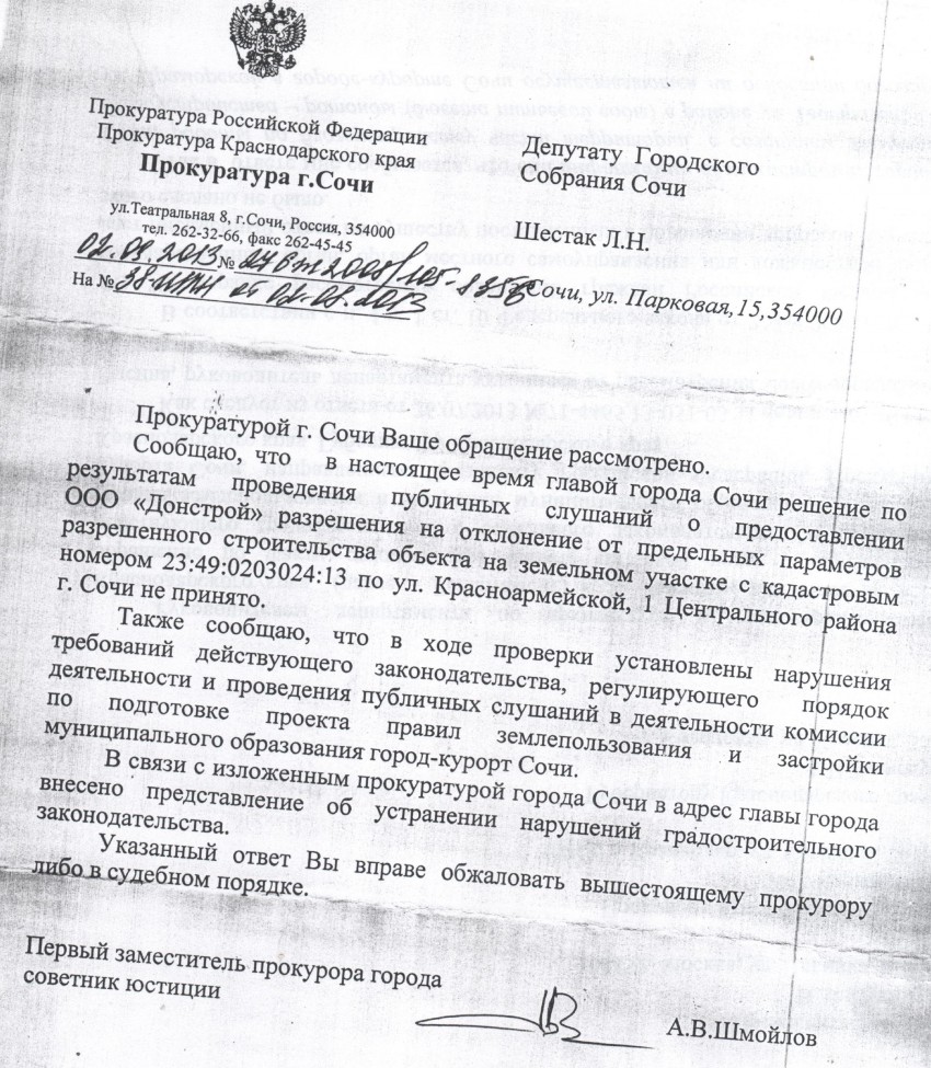 Только после обращения к депутату Государственной Думы Федерального Собрания РФ Обухову С.П. прокуратура города Сочи вспомнила о своих надзорных функциях и, как сообщил и. о. прокурора Краснодарского края инициировала признание в судебном порядке незаконными результатов публичных слушаний по Красноармейской, 1.