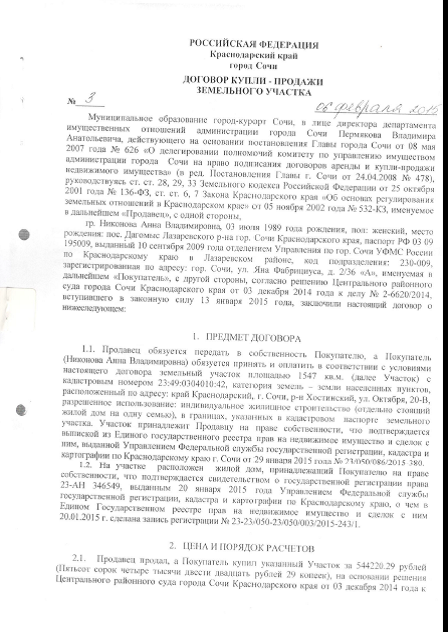 Таким решением Федеральный судья Тайгибов Р.Т. обязал администрацию города Сочи в лице Департамента имущественных отношений заключить с Никоновой А.В. договор купли-продажи земельного участка площадью 1547 кв.м с кадастровым номером №, предназначенный для «индивидуальное жилищное строительство», c выкупной стоимостью 544220 (пятьсот сорок четыре тысячи двести двадцать) рублей 29 копеек, то есть по 351 рублю за квадратный метр.