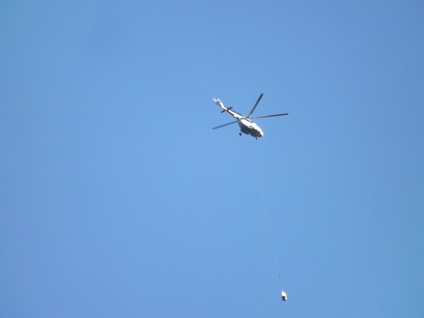 Возвращаясь из очередного своего " похода " задержался в Солохе. Утром разбудил грохот вертолета, пошел посмотреть что это там такое..., а том ничего необычного, все нормально, обычная вертолетная площадка в русле реки Шахе.