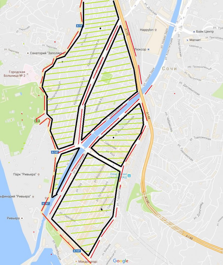 Вот обведённые чёрным и заштрихованные салатовым районы, по логике даны на «откуп» такси, мелкому грузовому транспорту и личному. Если нельзя им там останавливаться — зачем этот вид нужен. Я готов согласиться что по отмеченным красным дорогам не должно создаваться серьёзных (на это хочется обратить особое внимание — именно серьёзных) проблем для движения. Но внутри, между этими, если можно так сказать артериями, на прилегающих и дворовых территориях, обязанных обеспечить как раз подъезд, как уже говорил, личного и прочего транспорта, обязанного обеспечить удобства для жителей города, за счёт сети дорожек и подъездов — как можно ставить запрет? Сейчас многие зададут вопрос — а как обеспечить эти удобства, если количество авто тоже ставят свой своеобразный запрет. Вопрос правомерен, но тут он нас опять к мафии отправляет. Замкнутый круг скажете? Возможно, если сидеть сложа руки. Но думаю даже мафии назойливые мухи могут надоесть и невозможность избавится от них совсем, глядишь и заставит хотя бы кондиционировать воздух.