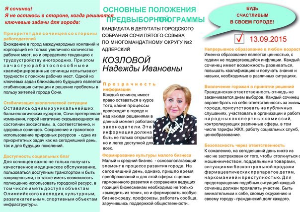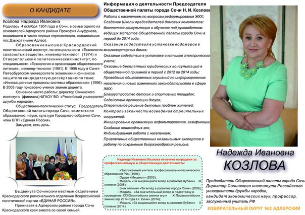 Предлагаю поддержать кандидата в депутаты Козлову Надежду Ивановну. Она сильный и опытный управленец, именно такой депутат нужен Адлерскому району в Сочи. Надежда Ивановна очень активный человек, она является директором Сочинского РУДН, а также Председателем общественной палаты и уже успела сделать не мало для города, давайте поможем Козловой преобразить наш город в лучшую сторону, поддержим ее своим голосом, наше будущее в наших руках!