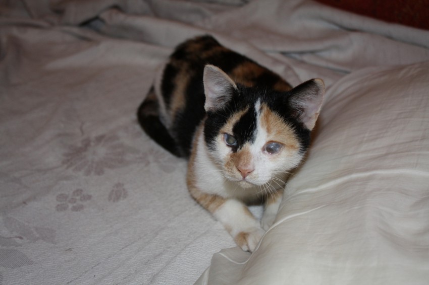 Первые недели ее жизни сложились не слишком удачно: из-за инфекции она ослепла. Мне на пути она встретилась слишком поздно, и я не смогла восстановить ей зрение. Так как ей с детства приходилось приспосабливаться жить так, она неплохо освоилась. По поведению она совсем не отличается от обычной кошки. Все необходимые для жизни предметы – миска с едой, вода, туалет, лежанка – она отлично находит.