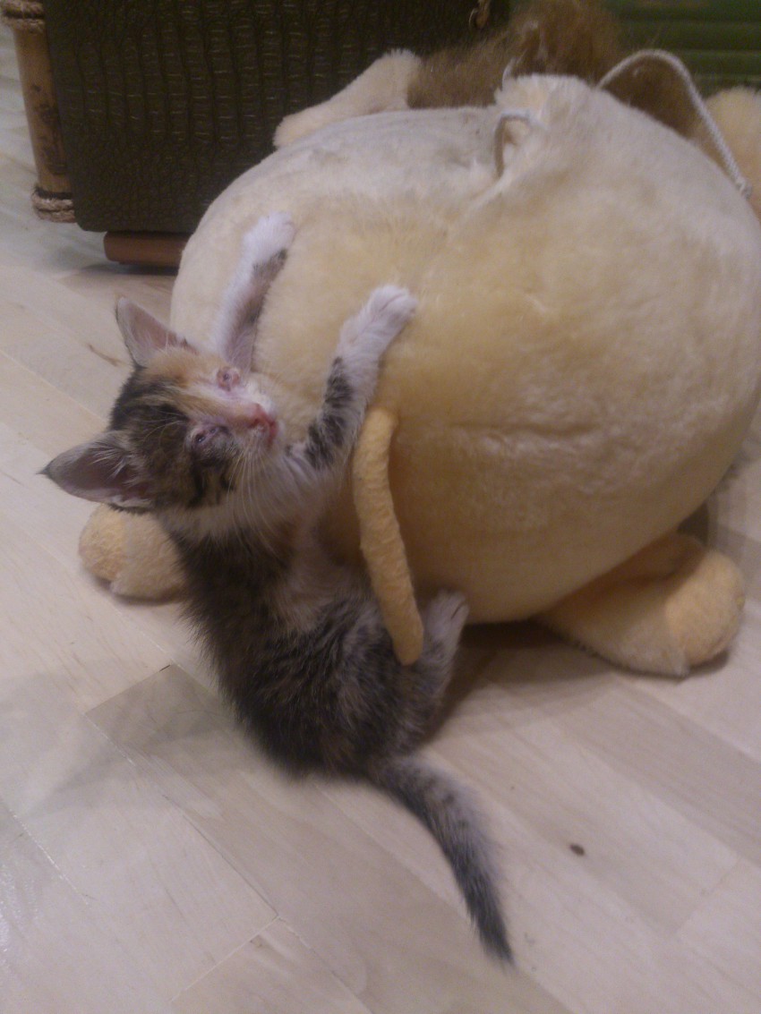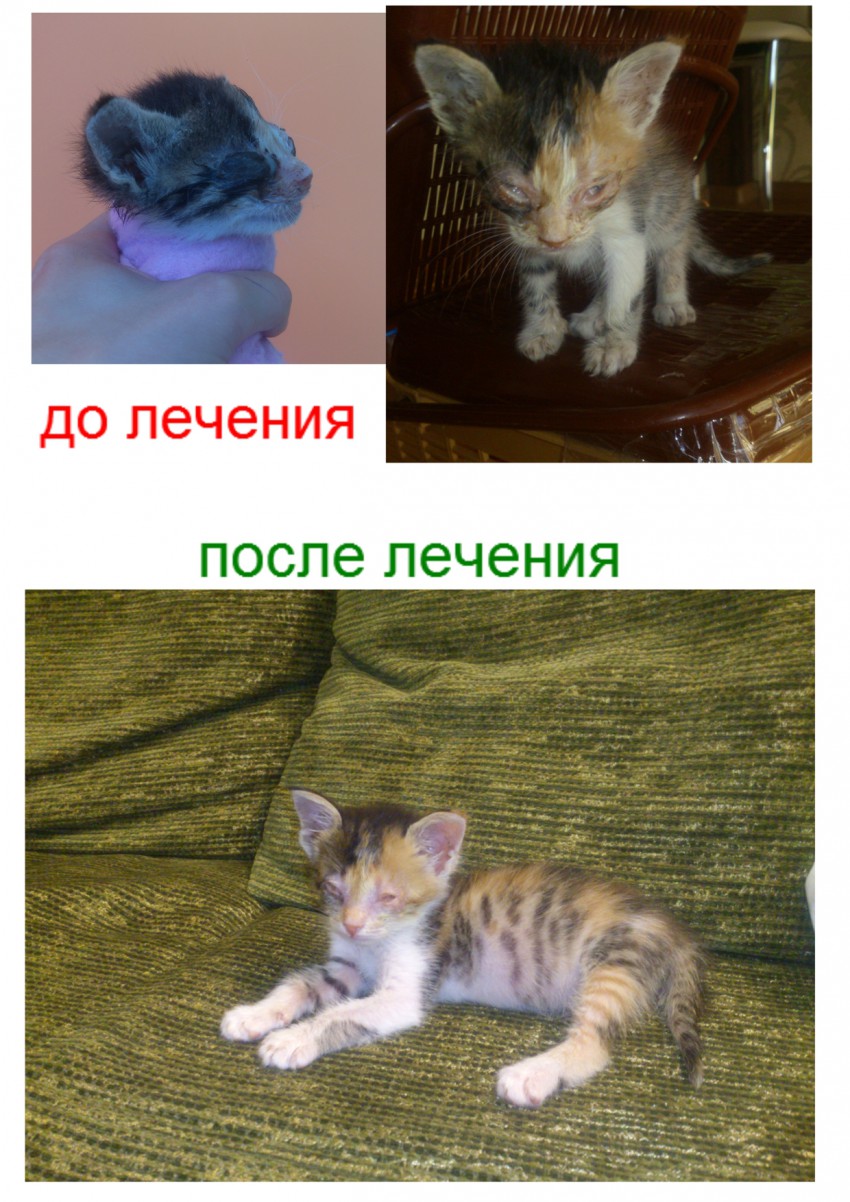 Я нашла эту трехцветную малявку еще трехнедельным котенком, который сам даже не ест. Она была в жутком состоянии: инфекция, гнойные глаза и нос, куча блох, яйца личинок мух на шерсти. Первую неделю выкармливала ее со шприца, потом она уже сама начала чавкать потихоньку. Тива прошла курс лечения, и теперь полностью здорова и готова ко встрече со своими новыми любящими хозяевами! Из-за инфекции Тивали осталась слепой. Но многие уже знают, что единственное обязательное требование в эксплуатации слепой кошки — это сетка на окнах в квартире. Больше она НИЧЕМ НЕ ОТЛИЧАЕТСЯ от обычных котят своего возраста. Она бегает, играет, ориентируется в пространстве, знает где туалет, вода и еда. Она прекрасно себя чувствует, потому что не знает, как жить по-другому. Это озорной и активный, вполне самостоятельный маленький комочек жизни.