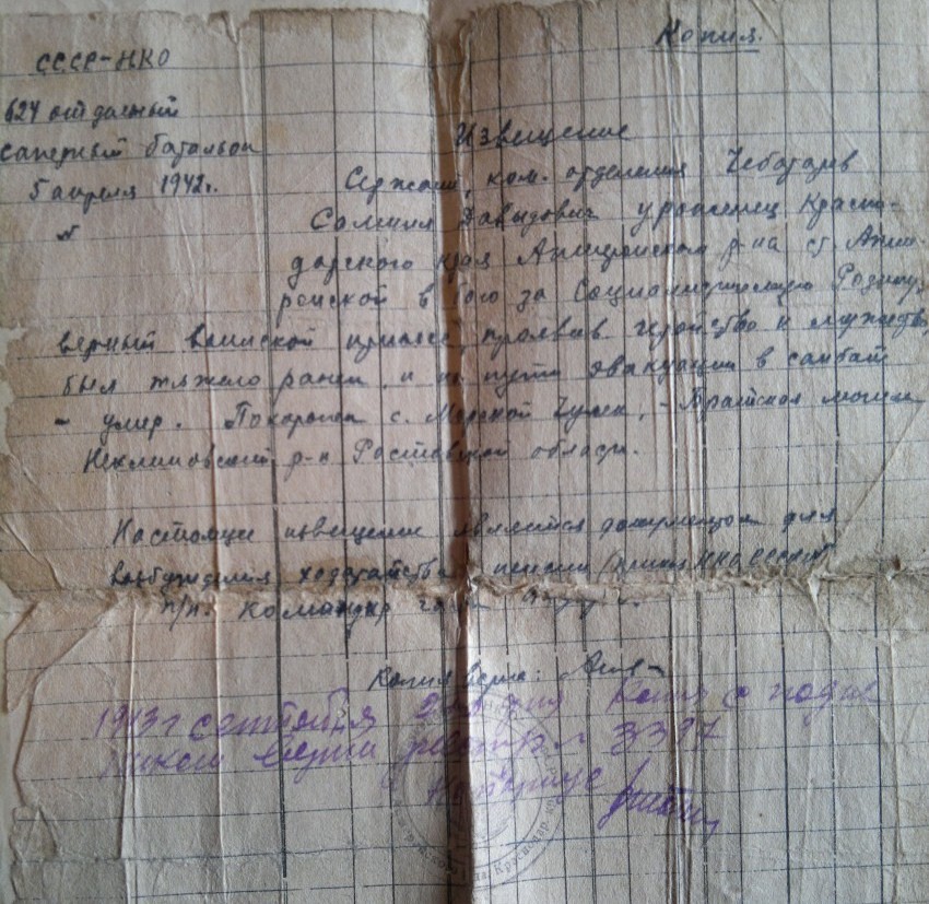 Копия похоронки, из которой следует, что дед умер от ран весной 1942 года (похоронка датирована 05.04.1942, но дата смерти не указана) года по дороге в сан.бат и действительно захоронен в братской могиле с. Морской-Чулек: