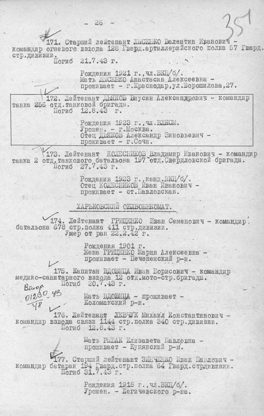 Читаю «извещение» (безудержно плачу). «Ваш сын командир танка воинской части 29537 лейтенант Дьяков Виулен Александрович, уроженец г. Москвы, в бою за социалистическую Родину, верный воинской присяге, проявив геройство и мужество, был убит 12 авгу-ста 1943 г. Похоронен: Смоленская область, Спасо-Демьянский район, д. Губино на граждан-ском кладбище. Настоящее извещение является документом для возбуждения ходатайства о пенсии (пр[иказ] НКО СССР). Командир части Халин. Зам. начальника штаба Панин».