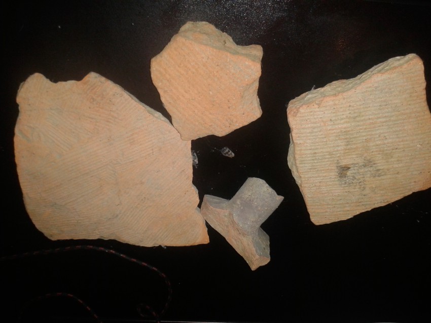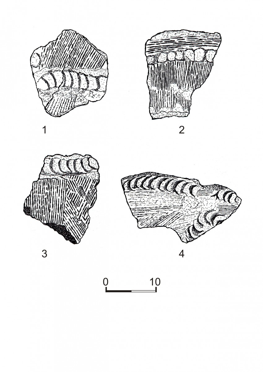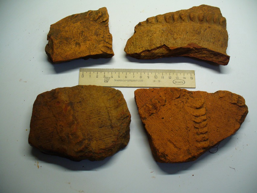 На рис. 1. изображены фрагменты с декоративными налепами, фрагмент №1 был найден в полосе прибоя и обкатан морской волной, фрагменты №2,3,4 обнаружены на поверхности глинистого обрыва и не были смыты в зону прибоя, поэтому они прекрасно сохранили свою декоративную поверхность. Аналоги фрагментов обнаруженной мною керамики описаны в трудах Ю. Н. Воронова «Древности Сочи и его окрестностей» (Воронов, 1979, с. 97-98. рис. 53), это соответственно керамика раннесредневековых пифосов с Ачипсинской, Пслухской, Бешенской и Куницинской крепостей. В трудах Д.Э. Василиненко Средневековый курганный могильник « Медовеевка-1» в долине реки Мзымта (г.Сочи) (Василиненко, 2007, с. 280. рис. 4.) также имеются очевидные аналоги найденной керамики.