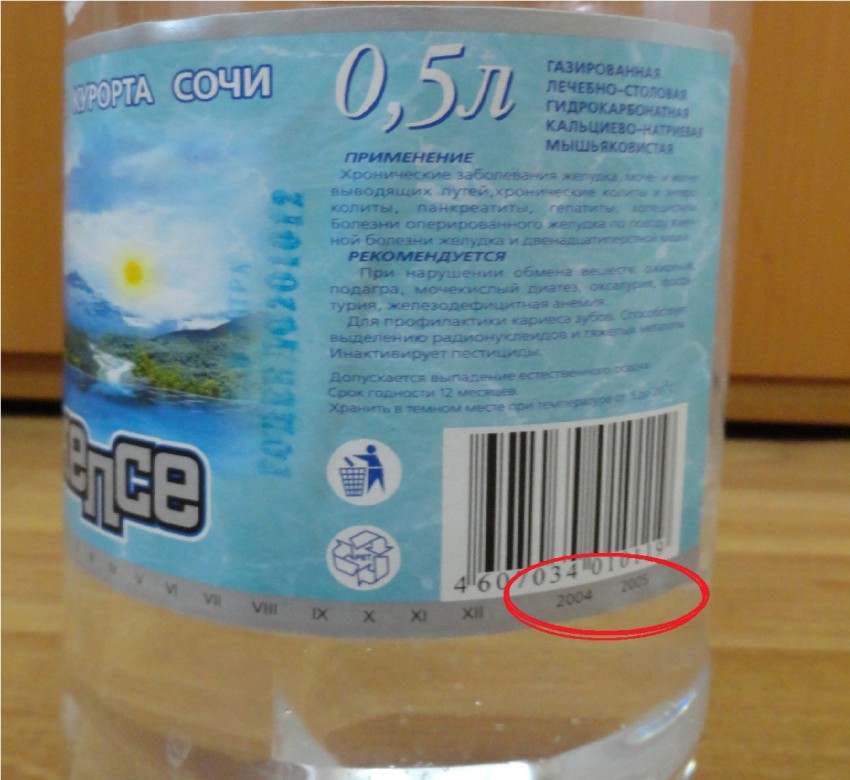 наклейка эта предназначена для бутылок вместимостью 0,5 литра, в нижней строке даты для указания даты производства обозначены только 2004 и 2005 годы. То есть получается, что эта наклейка лежала где-то на складах 8 лет. Так, может быть, там внутри была и вовсе не минеральная вода??? :) Хорошо обсмотрев всю этикетку увидела пропечатанную штампом фразу «1,5 литра Годен до 201012». Может так, конечно, и можно делать, но я такое увидела впервые, и у меня сразу возникло сомнение!!! Фото прилагаются )))