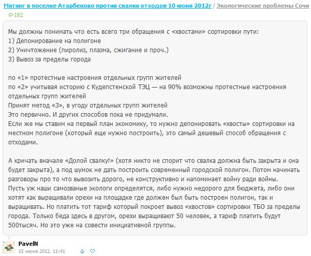 Напрашивается вопрос — полигон в Буу не построили и приходится теперь возить в Белореченск, при этом цена за вывоз поднялась на 70% — это власть такая слабая, что не смогла сопротивляться и настоять на своем — устроить в Буу свалку, либо власть такая сильная, однако в данной ситуации просто обиделась и сказала «ну, уроды, раз вы такие упертые, то хорошо — не будет свалки в Буу, мы теперь будем вывозить мусор в другой город, но вы все, всеееее — да вы просто оголтелые мещане и мы теперь с вас будем брать за вашу недальновидность… аж… аж… на 70% больше. Будете еще просиииить, будете еще вымаливать чтобы мы устроили вам свалку прямо в Сочи, но нет. БЕЛОРЕЧЕНСК. И точка. Но дороже. Спасибо скажите саботажникам. Вот идите, и скажите. А для кого-то это три пакета молока, хлеб для кого-то.