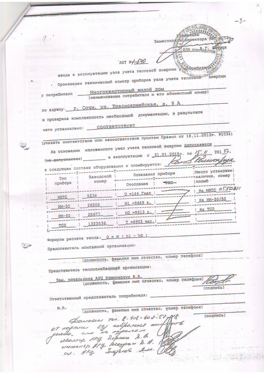 Учет тепловой энергии и теплоносителя на основе показаний приборов узла учета потребителя осуществляется с момента подписания Акта о его приемке в эксплуатацию.