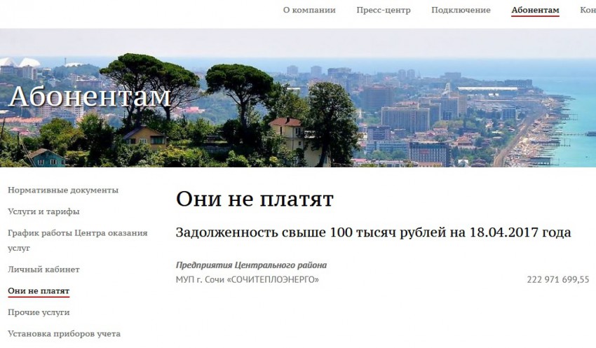 В списке предприятий центрального района числится такой должник, как МУП «Сочитеплоэнерго». Его долг перед водоканалом составляет почти 223 млн. рублей.