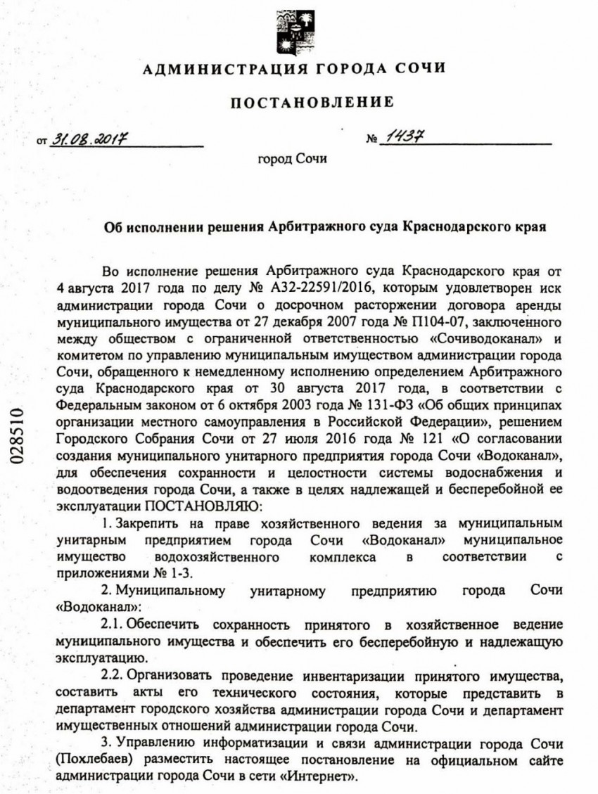 6 апреля 2018 года Арбитражный суд Северо-Кавказского округа отменил решение Арбитражного суда Краснодарского края от 4 августа 2017 года о расторжении договора аренды с ООО «Сочиводоканал», а также постановление Пятнадцатого арбитражного апелляционного суда от 12.10.2017. И отправил дело на новое рассмотрение.