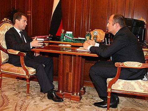 Премьер-министр России Медведев и главный яхтсмен Мельниченко. Наверно, обсуждают яхтинг?