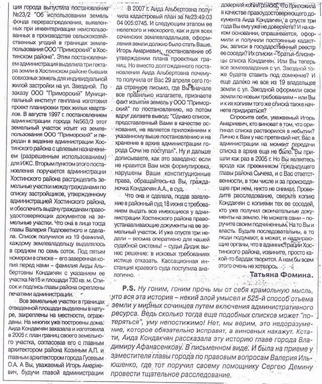 Пока Анна Григорьевна бескорыстно трудилась во благо будущей Олимпийской столицы, при молчаливом согласии и бездействии администрации и нечистых на руку государственных служащих, по другому их коррупционные действия нельзя назвать, отняли по сфальсифицированным документам, при нарушении Федерального закона «О государственном кадастре недвижимости » ст. 38 п.9 № 221-ФЗ от 24.07.07г., ГК РФ ст. 268 ч.3, собственное имущество, Уважаемых людей, в интересах третьего лица!