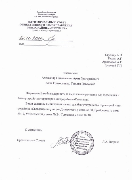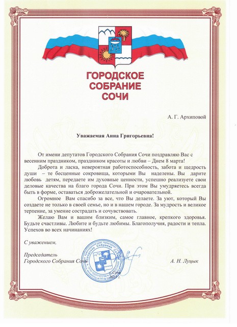 Все было приобретено на личные сбережения и бескорыстно отдано городу-курорту в надежде, что Сочинцы, подрастающее поколение, гости курорта, а главное Ветераны ВОВ и их семьи будут проходить лечение при улучшенном сервисе, при облегчении труда работников пищевого блока! От Городского Собрания г. Сочи вручено благодарственное письмо от депутатского корпуса, за подписью Председателя г. Луцык А.Н.. Благодарность от начальника Здравоохранения Администрации г. Сочи.