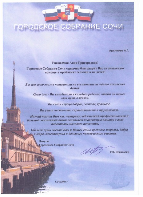 Очередная благодарность, администрации Хостинского района к Юбилею-80 и дню Победы, за подписью Главы Туркова В.П., за благоустройство улицы Учительской, которая стала безопасной, чистой и образцово — показательной в микрорайоне « Светлана ». Анна Григорьевна награждена медалью « За благоустройство Сочи к 150-летию города ». С большим воодушевлением Анна Григорьевна восприняла программу Президента по подготовке г. Сочи к Олимпийским играм 2014г…