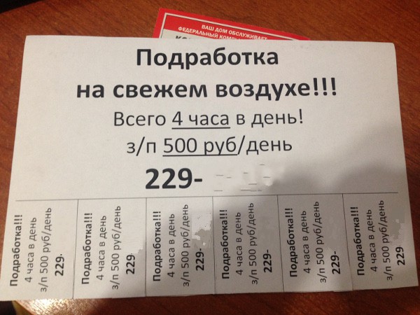 Увидела на улице объявление (ещё оно может быть на разных сайтах с работой, смотрите на номер 229-42-02) позвонила, меня пригласили на собеседование, там мне дали прочитать инструкцию и листочек с системой штрафов (сначала на него не обращаешь внимание, но потом он оказывается решающей частью). Никак меня не оформляли, просто отксерокопировали паспорт, после чего сразу же дали материал для работы (визитки, клей, объявление) и дали карты по которым надо ходить. Мало того, что там замонаешься ходить по этим домам, ещё и нужно отработать ровно 4 часа, иначе лишат зарплаты. А проверяется это так: звонишь когда начал работать и когда закончил.