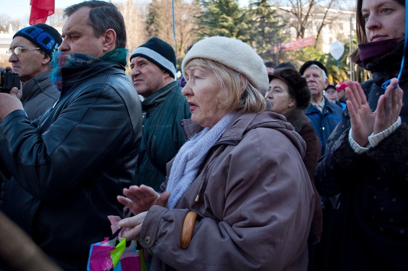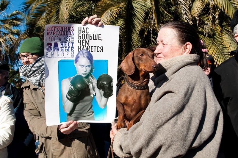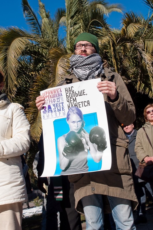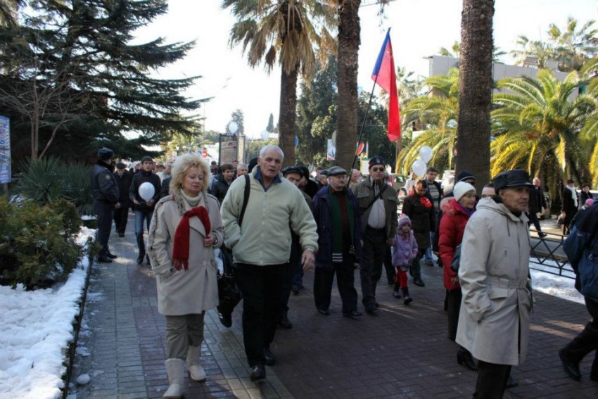 Сегодня прошел очередной митинг-шествие за свободные выборы. В 2 часа начались сборы митингующих напротив администрации города Сочи, затем они продолжили свой митинг шествием к площади центрального универмага, на площади собралось около 200 митингующих, митинг длился около 2 часов. Основным лозунгом митинга являлось требование честных выборов.