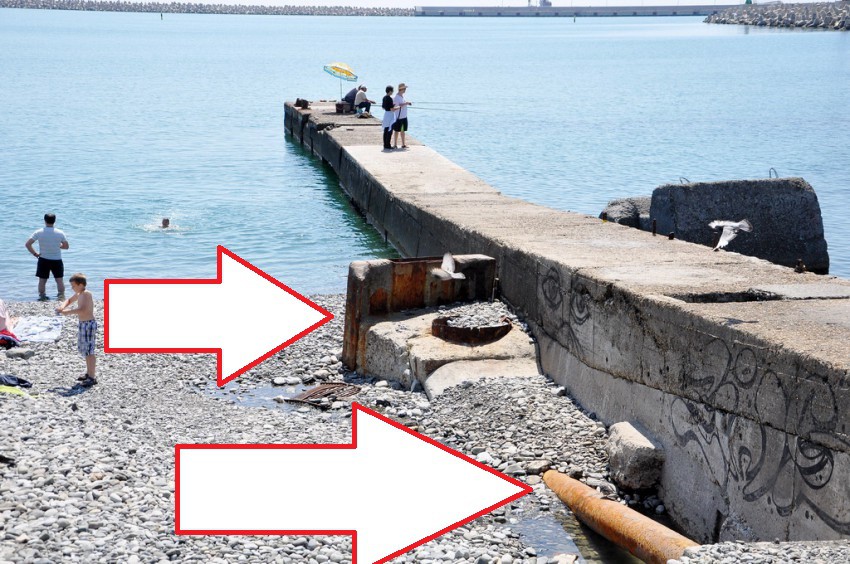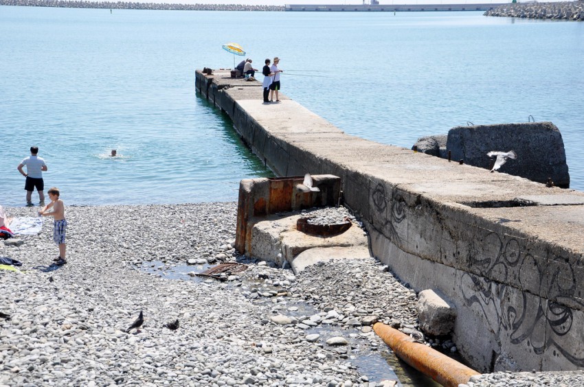 Пришлось успокоить любителей пляжного отдыха и провести их на пляж «Маяк», вернее то, что от него осталось. Показалось, что гости сходу в карьер рванут купаться, но пляж не произвел на них впечатление, тем более, что из прохудившейся ржавой трубы прямо на гальку вытекала непонятная жидкость. Пришлось отправиться искать хороший пляж дальше.
