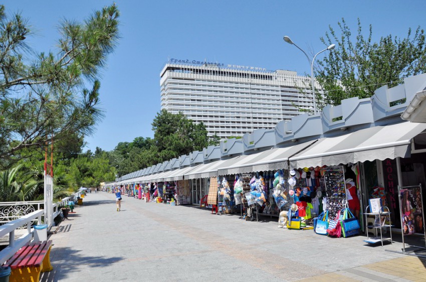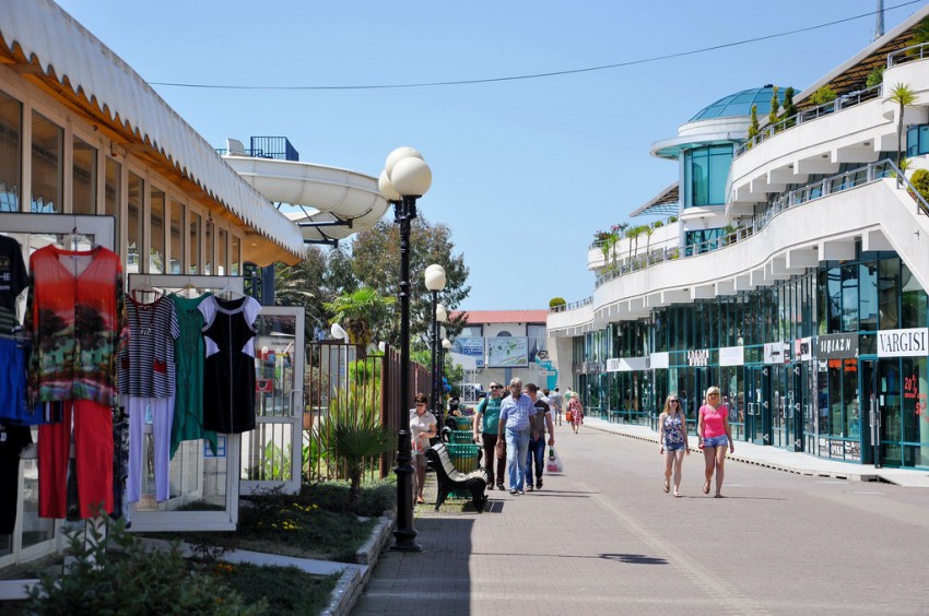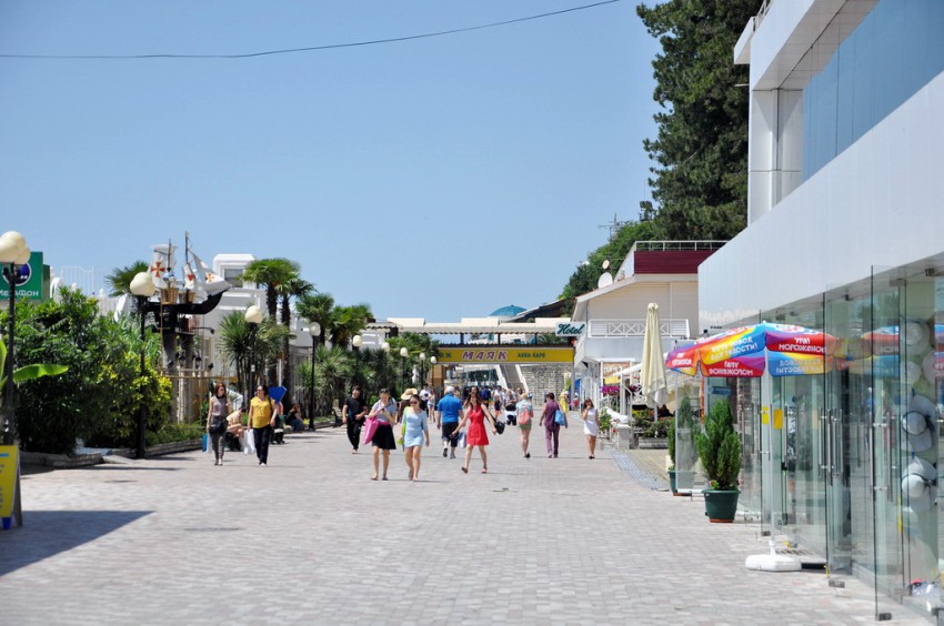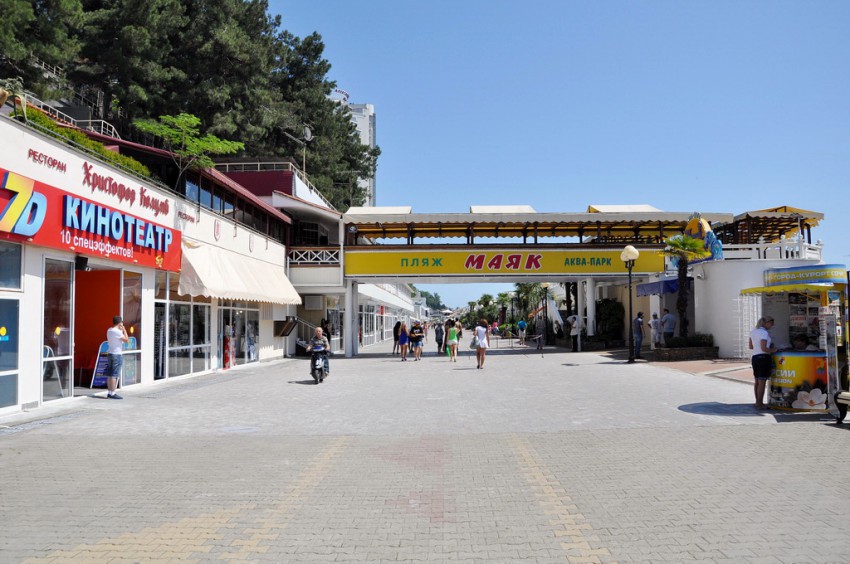 Попав в коридор из магазинов и кафешек, мои спутники закрутили головами и рванули к вывеске с надписью «Пляж «Маяк». Пляж оказался закрытым аквапарком, а впереди снова замаячил коридор из магазинов и кафе, разочарованию гостей не было предела. Где пляжи?