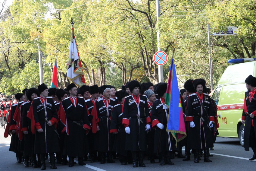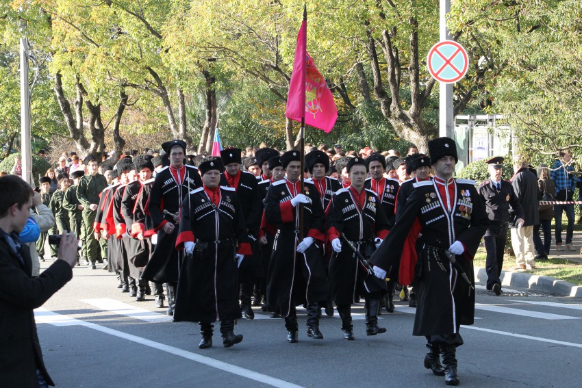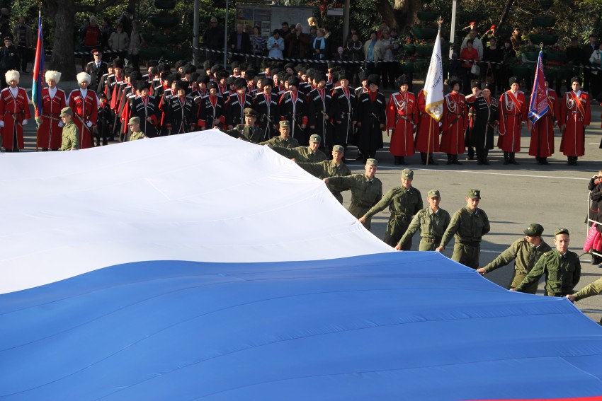 В рамках празднования дня города Сочи сегодня на площади Зимнего театра состоялась торжественная акция Служу России, Кубани, Сочи! Был развернут самый большой флаг России. Прошёл парад казачьих войск.
