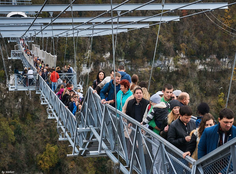 Все парковки скайпарка были забиты машинами, и припарковаться оказалось не просто. А мост превратился в народную тропу