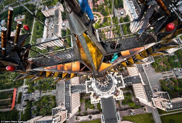 А здесь в кадр попали ноги экстремалов, поднимающихся на шпиль МГУ без страховки. Кто-то ещё и в обычных ботинках…