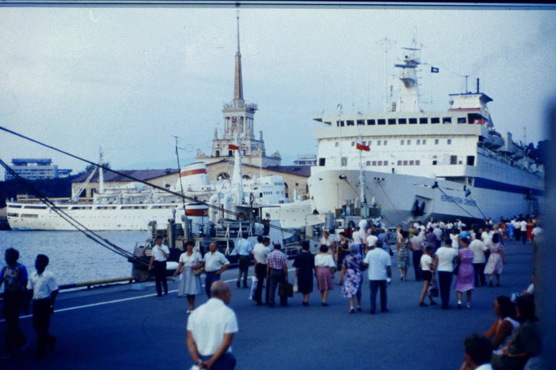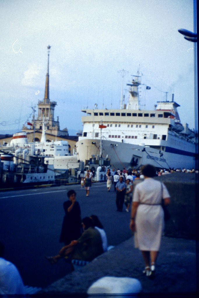 Интересный кадр, прямо таки вкусный! У причала теплоход «Константин Симонов», построенный как раз в 1982 году и переданный Черноморскому пароходству 10 августа 1982 году, с портом приписки Одесса.