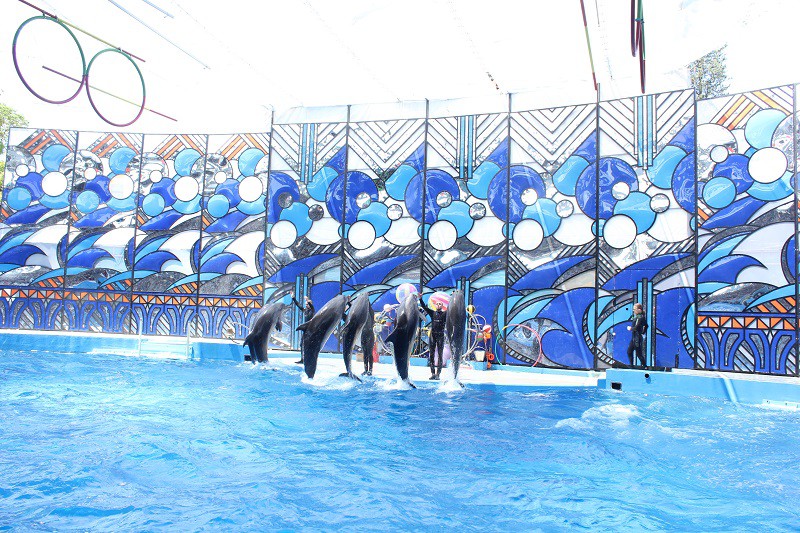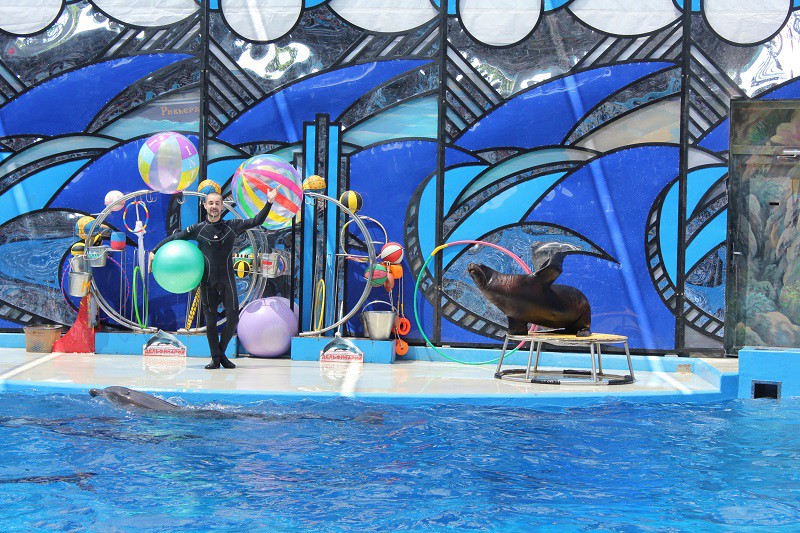 А потом все собрались на представление в Дельфинарий. Не была там давно. Сейчас там аж семь дельфинов выступают. две белухи, морской котик, морж и четыре тренера))