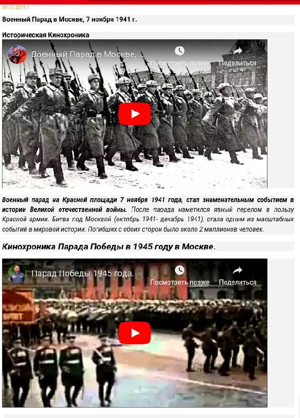По этому же адресу можно посмотреть фильм о военном параде в Москве 7 ноября 1941 года, с которого советские воины уходили на фронт защищать свою Родину от гитлеровских агрессоров.